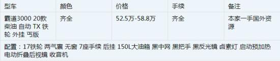 2019款丰田霸道3000搭载的是3.0升D4D发动机,微信电话:13388063216 (成经理)与之相匹配的是VX-R 5速自动变速器。2019款丰田霸道3000配备了高级的三区域独立控制自动空调,可以对驾驶席、副驾驶席、后部座席三个区域进行认知。新增了电子控制式悬架系统、主动牵引力控制系统、HAC DAC上下坡辅助控制系统等高性能装备,强化了该系列的越野性能。