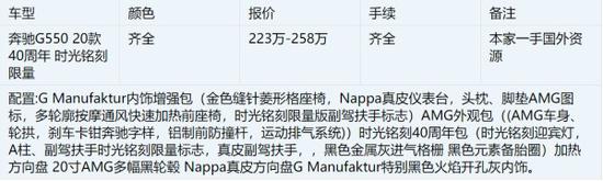 20款美版 G550 时光周年纪念版 钻石白金属漆-玛奇朵/游艇蓝内饰#340732 浅褐色禅木装饰 加热方向盘 纳帕真皮方向盘 独家内饰包(菱形格纳帕全真皮内饰 无边框内后视镜 DINA顶棚 纳帕真皮仪表板 菱形地垫 主动式多轮廓前排座椅 前排按摩座椅 快速加热通风前座椅) 暗夜包(黑曜石备胎边盖 黑曜保险杠 黑曜格栅 黑曜外保护条 针状条纹外观 黑色防撞条 浅色调大灯 浅色调指示灯) AMG Line 包(AMG车身造型轮拱 LOGO刹车卡钳 车身防护铝制套件 运动排气 ) 时光纪念加强包(镜子徽标投影仪 车身时光标 乘客扶手内部徽章 真皮扶手 宽屏仪表盘) stronger than time 标环车影像 雷达测距 12.3英寸屏幕 柏林之声音响 LED大灯 64色车内氛围灯 20英寸多幅AMG轮毂