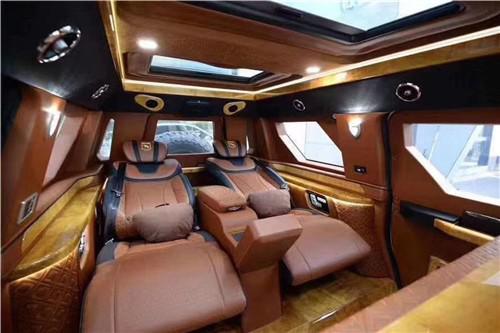 乔治巴顿内部配置:前排座椅8项电动座椅,中排8项加热通风按摩电控座椅,后厢独立空调,10°后舱LCD娱乐屏。阿尔派音响,前排车载导航蓝牙系统。USB顶棚触摸式阅读灯+氛围灯条。铝合金内饰,复古高光原木风格,钢琴烤漆地板。