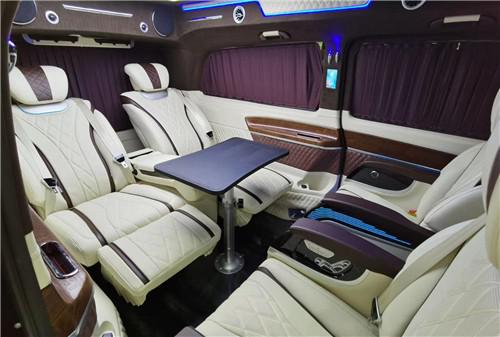 后舱的内饰和迈巴赫的原厂座椅。车身全部皮革包覆,檀木面板奢华点缀,牛皮地毯,迈巴赫宫格顶灯,以及绒质窗帘一应俱全,还有两张定制的迈巴赫总裁座椅,十分舒适豪华,通风加热,气压按摩,三段调节等功能加持。后排的沙发座椅可以放平成为双人床,尾车上出行人员提供舒适的休息。