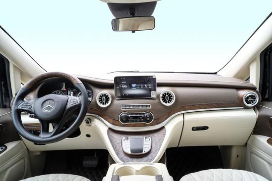 展厅奔驰威霆VS680版前仓升级了Vclass中控,包含导航及倒车影像,采用了有“希腊神树”之称的岑木作为驾驶室整体饰板的主材料,纹路清晰可见,触摸手感细滑自然。可以说是难得一见的良品。