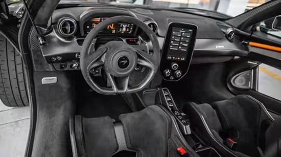 在驾驶舱内部,超大的竖屏液晶中控显示器使这台车的迈凯伦基因突显。碳纤维赛车座椅无论是在包裹性还是肋部支撑性上,都有非常不错的表现。为了避免驾驶者分心,三辐式方向盘没有设置任何多功能按钮和影音系统控制开关,这样一来就大幅度提高了驾驶的专注度。