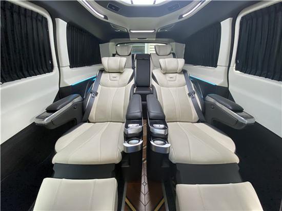 V260商务车乘客舱第二排采用的是电动航空座椅,可旋转,全车皮质都是才用的nappa皮,并带有脚托功能,舒适乘坐,附有加热、通风、电动调节、腿托、按摩、记忆、电动头枕、电动靠背等功能。