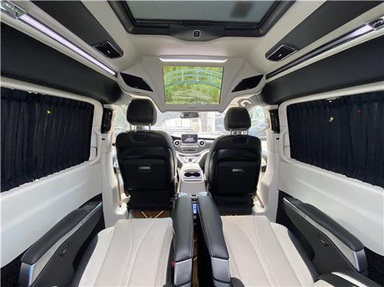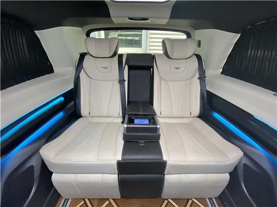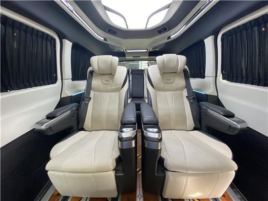 V260商务车乘客舱第二排采用的是电动航空座椅,可旋转,全车皮质都是才用的nappa皮,并带有脚托功能,舒适乘坐,附有加热、通风、电动调节、腿托、按摩、记忆、电动头枕、电动靠背等功能。