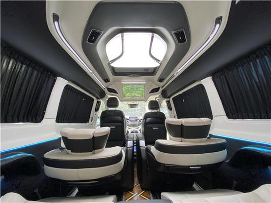 车顶上方采用全方面全景天窗的设计,1排和二排之间还有一个悬浮液晶电视,三排座椅采用的是阿尔法风格真皮沙发床,可180度放倒,便是一张柔软舒适的双人床,白天的时候可以将座椅放平,天窗打开,感受一下阳光、看一下风景,晚上的时候可以看一下星星。