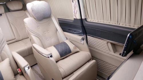 在乘坐性方面,奔驰V250改装版本依旧延续了经典的7座式格局,2驾驶座+2航空座椅+3连电动沙发床的设计,主副驾驶配备后台板以提供旅途中必要的置物小桌的需求;中间属集成了旋转电动、通风加热按摩等8项舒适调节的总裁座椅,后排可倒放平躺的双人床足以缓解旅途疲倦。
