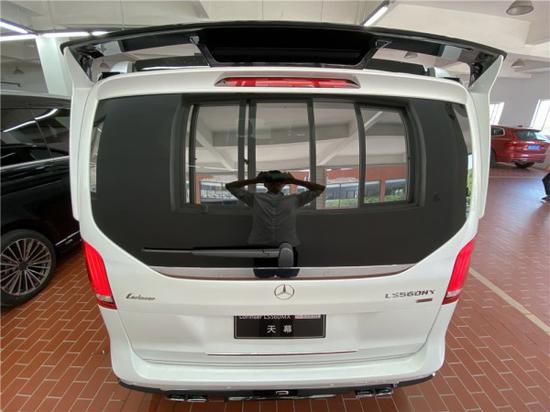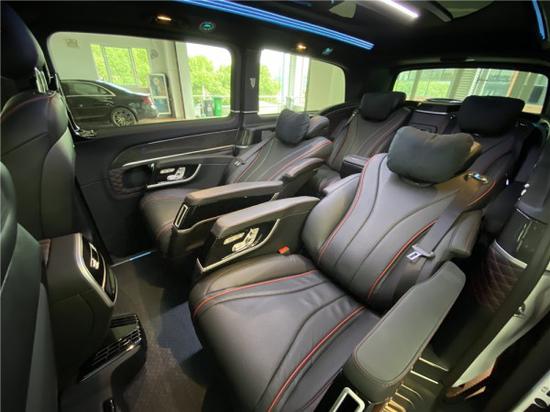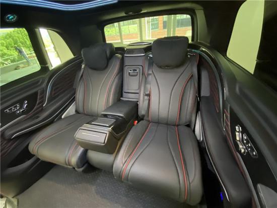 一打开车门,就知道这车真的是不可以貌相,中排两个豪华航空座椅,同样多项电动调节功能,头枕采用迈巴赫的设计,在座椅前方搭载独立式脚踏,让贵宾坐于其中,每一个支撑点都十分舒适。