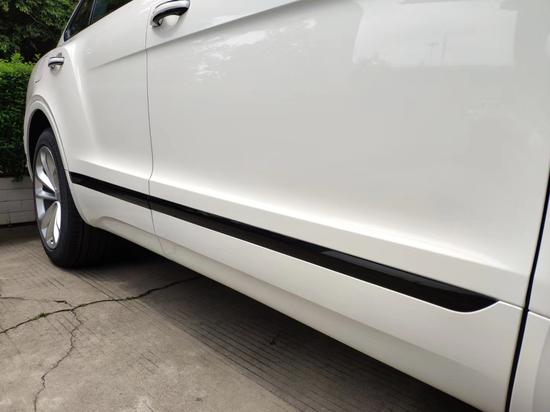 标志性的灵动线条、凌厉棱角与光洁圆润的表面交汇融合、浑然一体,勾勒出添越超前的铝合金外观,赋予宾利传统设计语言以新的内涵。车身采用航天工业首创的创新超塑成形技术,线条刚劲威猛,轮廓分明的特色罩型线沿前轮跃然车侧,惊艳夺目。”B“ 字型翼子板和采用抛光饰件的硕大车轮,让车身细节更加惊艳。
