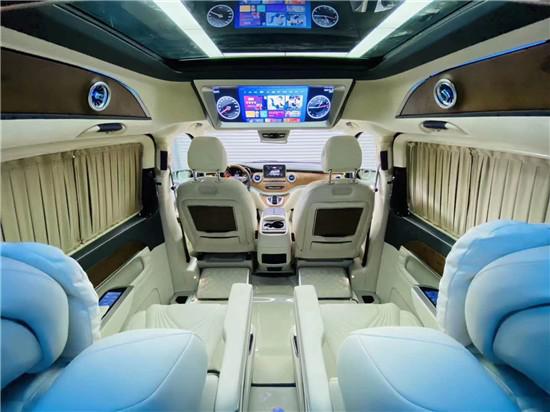 奔驰V260改装迈巴赫 加装高顶更大更豪,奔驰七座商务车的内饰当然也是精益求精,豪华属性一直都是奔驰的代名词,进入驾驶舱,驾驶舱中控台采用镶嵌包裹;悬浮显示屏,真皮包裹的多功能方向盘,另外正副驾驶座椅全部采用真皮包裹。中控液晶导航大屏 搭配扶手冰箱 看上去非常简约。操作起来却很优雅。
