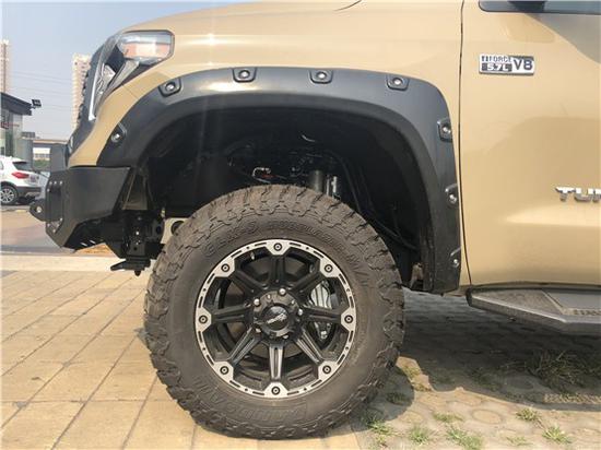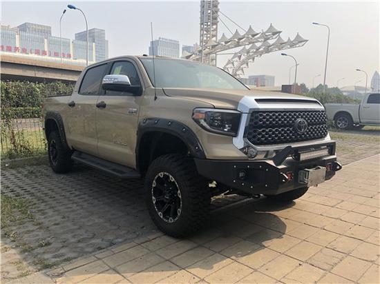 20款丰田坦途TRD版皮卡的车头前脸造型上更加硬朗,粗壮的横幅格栅展现出极其坚实的力量感,宽大硬朗的车身,粗犷有力,凸显美国车的风范,前脸明显外张的挡泥板以及前突的坚固格栅尽现强悍风格。