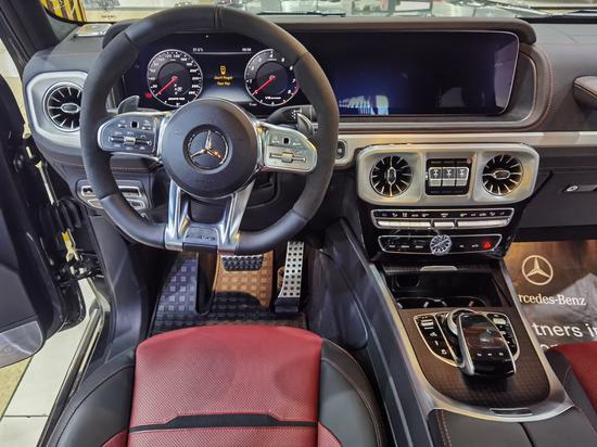 奔驰G63内饰的整体设计更加现代化,中控台配备了12.3英寸宽屏幕信息娱乐显示屏,内饰材料也有所改进,有助于提升车内档次。三幅式多功能方向盘采用镀铬装饰,多功能按键的分布更加方便操控。