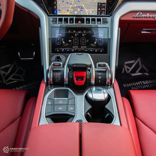 这套挡杆机构是最有意思的地方,造型来自战斗机的控制推杆,左侧设置ANIMA选择器是兰博基尼动态驾驶的关键,提供STRADA(公路)、SPORT(运动)、CORSA(赛道)、SABBIA(沙地)、TERRA(越野)和NEVE(雪地)共6种驾驶模式可选,右侧则为底盘、方向盘和悬挂调节,同时还可自定义储存车辆设置。点火按键位于红色翻盖下方,点火和熄火时都需要将盖片翻起,像极了导弹发射的按键,这种独一无二的点火方式仪式感十足,让人爱不释手。从图上可以看到,点火按键左右侧分别设有P挡和M挡,顶部有R挡,那么问题来了,D挡和N挡跑哪去了呢?