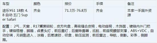 18款途乐Y61中东版4.8L 参数:长5080mm,宽1940mm,高1855mm,轴距2970mm,前轮距1605mm,后轮距1625mm,最低离地距215mm,最小转弯半径6.1m,自重2535kg,4.8L 24气门TB48DE发动机,额定功率:209kw/rpm,最大扭矩:480N.m/rpm ,油箱容积95+40L,5速手自一体变速器,转向助力:液压助力,驱动方式:分时四驱,刹车(前/后) 通风盘/通风盘,悬挂形式:(前/后) 非独立悬挂/非独立悬挂。