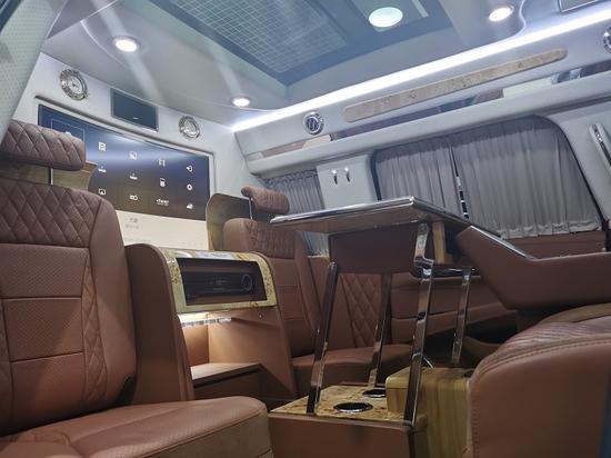 四座凯迪拉克拉克总统一号是空间感私密感都有很好的突出,后背箱储物随心所以,动力上搭载的是一款6.2L V8发动机,匹配10速变速箱,让驾驶随叫随到,大面积的雀眼枫木装饰使内饰奢华感倍增,在吧台下方有一张隐藏式电动商务会议桌是您办公的理想座驾。