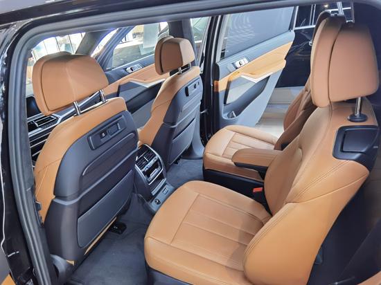 宝马X7内饰: 其实真正吸引你的是宝马X7的内饰,棕色的真皮,让整车内饰不单调,然后水晶的电子档把,非常绚丽,我被深深吸引了,有摸两下的冲动。12.3英寸的中控大屏幕加上全液晶仪表盘,非常有科技感,而且显示效果很赞,有11种氛围灯可选,提升了内饰的档次和情调。内饰的做工和用料无可挑剔,储物的地方也挺多的,内饰的细节也处理得很到位。