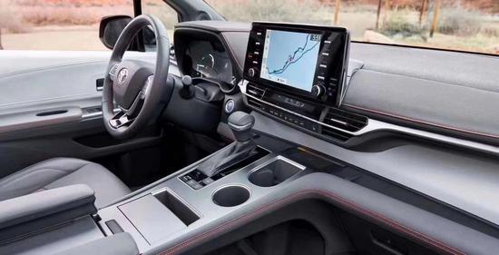 全新塞纳在内饰部分的变化非常之大,一改现款车型中庸的设计,整个中控台都是偏向驾驶员一侧的设计,并且上中下区域划分明显,精致感十足。配置方面,全新Sienna提供12扬声器、在线导航,苹果Carplay、Android Auto、抬头显示、全景影像以及丰田最新的主被动安全系统。