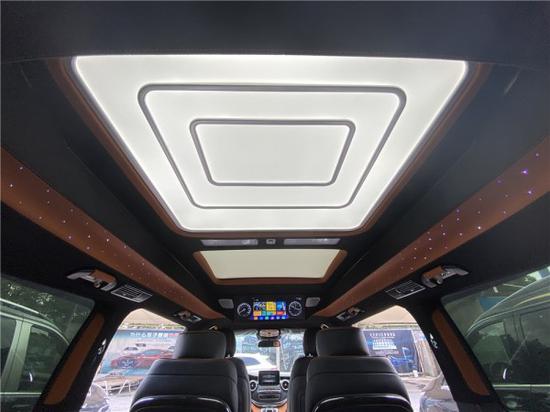 因为这款奔驰V级商务车采用了加高顶的设计,所以在车内可以十分奢侈的配置一款车顶LED大灯,回字形花纹设计,和大灯前部的全景天窗相辅相成。