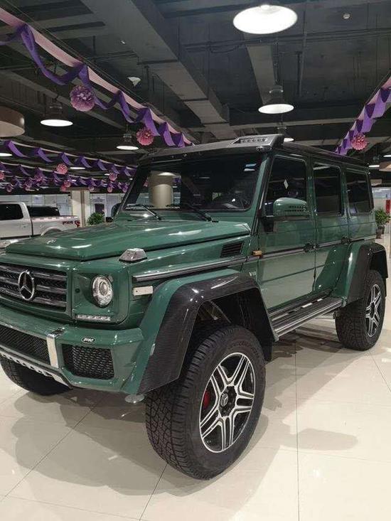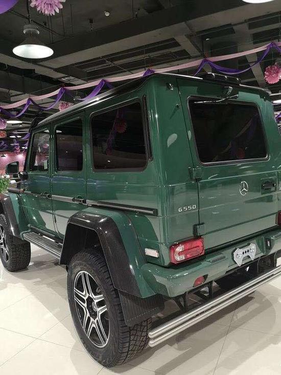 17款 奔驰G (配置|询价)550 4x4² 颜色绿黑 22轮;红卡钳;双减震;单天窗;氙气大灯;LED日行灯;18向多轮廓电动包裹座椅;翻毛皮内饰(皮+翻毛皮双拼座椅;翻毛皮方向盘;翻毛皮门板;翻毛皮内顶);前座椅加热通风;二排座椅加热;哈曼卡顿音响(14个扬声器);三把差速锁;碳纤维内饰套件;脚踏;前雷达;倒影;导航;多功能方向盘;定速巡航;换挡拨片