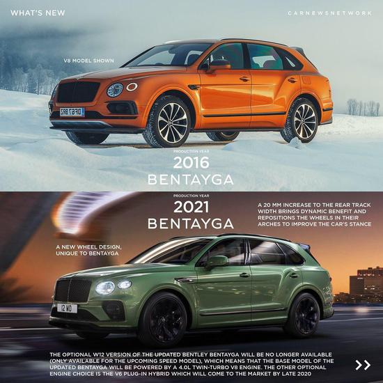 宾利添越 (配置|询价)车型进行了许多细节上的修改,新车中网面积相较于老款更大,角度更为直立,看起来更加大气。前保险杠轮廓进行了全新的设计,两侧的导流孔面积更大,为车头增加了一些运动元素。车身侧面的线条十分修长,硬朗的腰线十分的具有力量感。