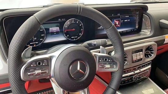 20款奔驰G63AMG换装了全新造型的平底式AMG运动方向盘,其两侧配以打孔皮质包裹,下部镀铬装饰的造型也与新G500明显不同,看上去十分战斗。李冰冰 此外,全液晶仪表盘+中控大屏的双12.3英寸屏幕设计在新车上也没有缺席,营造出了浓郁的科技感。