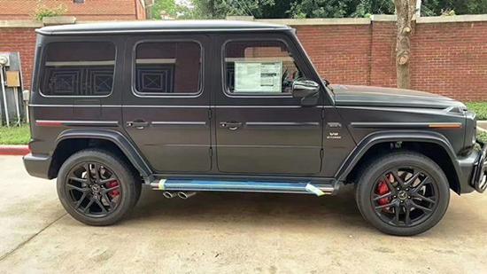 20款奔驰G63AMG侧面上与上代车型差别不大,依旧是非常反正的设计,看起来非常的复古,轮眉的设计也依旧硬朗,图中可以看得到这部车的红色刹车卡钳,营造出来的运动气息还是非常浓厚的。整车的腰线设计没有半点的拖拉,所带来的一体感更加强烈。