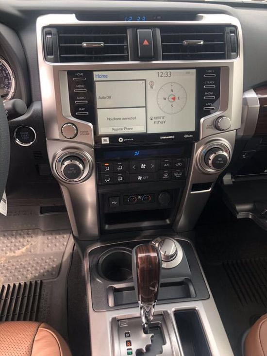 丰田4Runner内饰方面,整体还是非常像普拉多 (配置|询价)的,中控面板采用了更多的银色镀铬设计,4Runner为了提升档次还在内饰加装了木纹饰板,中控整 体为黑色,与座椅的橙色相互搭配。淡化了居家感,但更加运动,配色也更耐脏。整体中控的设计是丰田家族式设计,用在这个级别的越野SUV上,易读易用,结 实抗造。田家属的血统。
