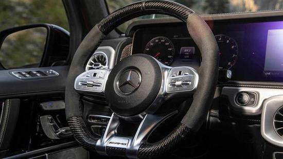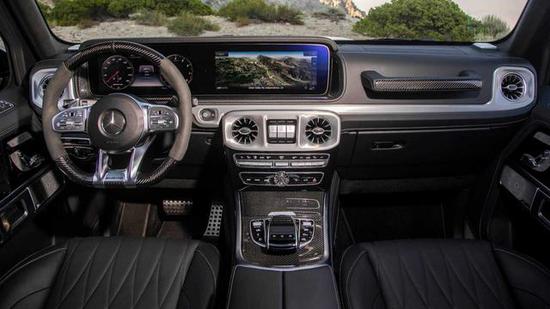 全新奔驰AMG G63内部采用了全液晶仪表与中控屏组成的双12.3英寸超大屏,让车内的科技感和豪华瞬间提升;方向盘也由原来传统的四幅式升级为平底式运动方向盘;新车在两侧门板及中控台部分选用碳纤维材质进行覆盖,并辅以网格缝线的真皮进行点缀,中控台出风口采用了镀铬装饰,整体看上去很上档次。