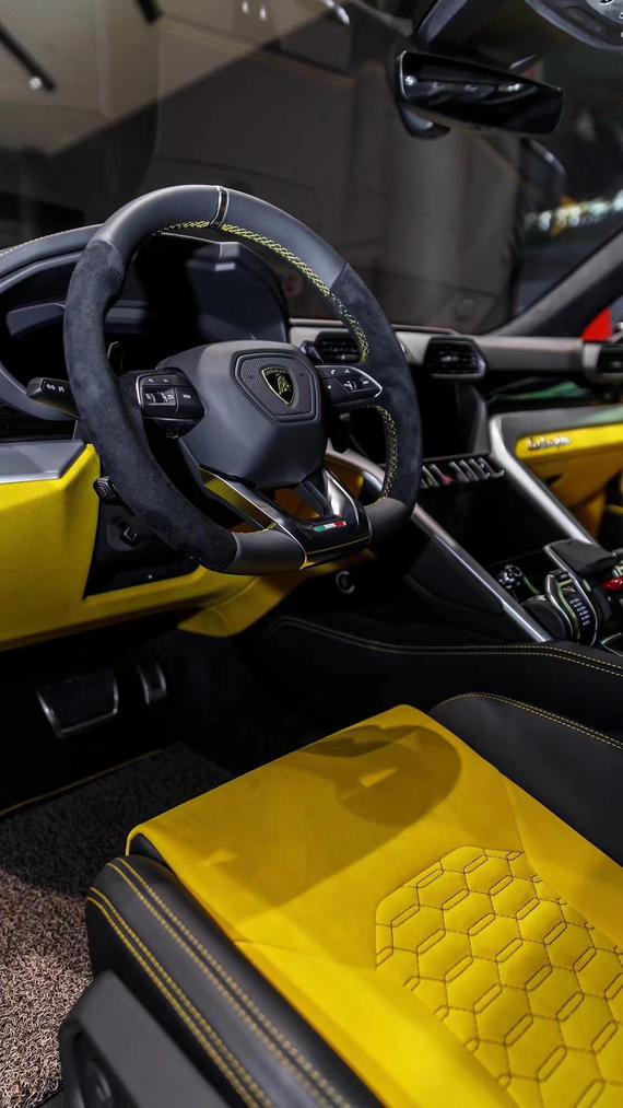 兰博基尼URUS内部设计和内饰呼应着它的外观,拥有鲜明的兰博基尼风格、色彩和个性。博基尼希望为驾驶者提供一种飞行器的驾驶感,座舱的调控皆触手可及。中控台采用了大面积的碳纤维材质,上下双屏的设计让整车充满了科技感。上方屏幕是常规的多媒体系统,从图中可以看出,该车中控屏不仅显示清晰,还配备了夜视系统。下方屏幕主要是控制空调系统和座椅通风、加热功能。兰博基尼Urus的方向盘采用了真皮+翻毛皮材质包裹,手感特别棒,方向盘上的多功能按键阻尼适中,换挡拨片使用起来相当顺手。
