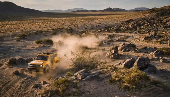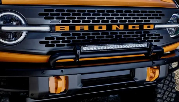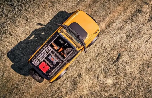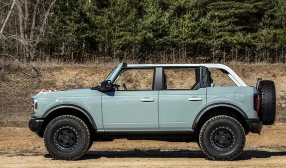 全新福特Bronco 的短轴版车型和长轴版车型的车顶都采用了可拆卸式的设计,它的车身非常的方正,采用了十分硬派的造型的设计。全新福特Bronco还提供个性化的定制设计,比如新车可以选择门板上一个镂空风格的多边形的造型,也可选择车顶部的探照灯,看上去质感十足。全新福特Bronco的侧面采用了拼接式的风格打造,它的轮拱也比较突出,整车的离地间隙非常的高。