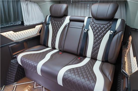 全部采用真皮制作,豪华木饰装点,带有按摩加热通风功能。后舱前为两个独立航空座椅,第二排座椅安装进口首席航空座椅,加热通风按摩功能齐全,最大限度的减缓您的乘车疲惫。八向电动调节:电动头枕,电动腿托,前后电动调节,电动靠背调节。第三排为一组沙发座椅,可电动展平,形成一张舒适的沙发床。