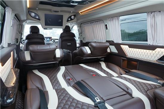 奔驰V260改装7座商务车后排座椅支持180度平躺;为您的长途出行打造临时床铺奔驰V260高顶,七座车型的第三排沙发,支持一键放平或者收起,随时为您的长途出行打造足够宽敞舒适的卧铺,简约时尚的氛围灯与豪华柚木地板交相辉映,是对精致移动生活的皮质追求。