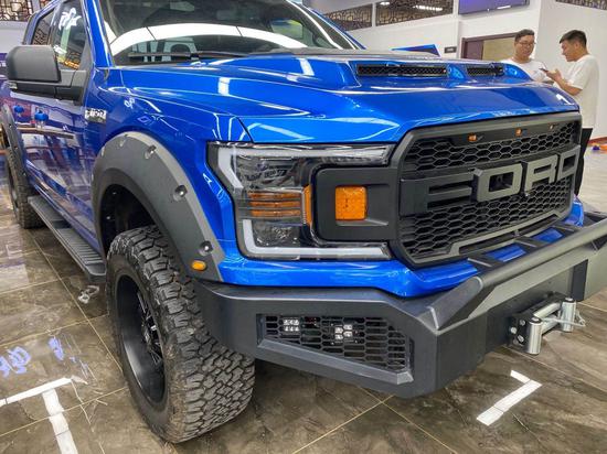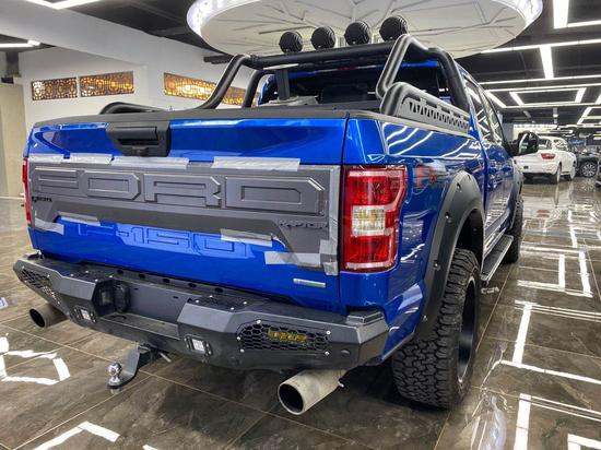 全新福特猛禽F150方方正正的前大灯与前保险杠造就了完美的车头造型与比例,进气格栅采用蜂窝状网格设计,并配以雕刻式的福特品牌标识。其前保险杠相当硬朗,且保险杠下方配备金属护板,以应对极端路况环境。整体的车架由高强度钢冲压而成,这样不但提高了车身的耐用性,更对乘客在安全方面有了进一步的保证。