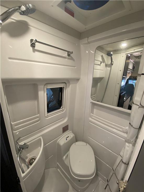 车内卫生间位于车厢尾部,采用的是一体式设计,内部提供了赛特福德马桶、淋浴、梳妆镜等设施,搭配120L净水箱和60L灰水箱。