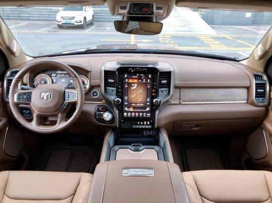 在你打开车门的一瞬间,你就能够感受到这款皮卡的豪华感扑面而来,肉眼能够看到的地方几乎全是皮革材质,仪表板、车门把手、门饰板都是百分百全粒面皮革。对于座椅还是有些许不同,座椅表面还镶嵌有鳄鱼浮雕图案,手套箱以及中控台等处也均有这样的铭牌标记,时刻提醒你这款皮卡身份的高贵。此外,一些细节点缀均采用镀镍的形式,并且为了与长角号这个名称更为贴切,车内多处采用了实木材质,营造一种乡村的感觉。更多优惠详情或者关于进口车的咨询联系文章底部电话通微信