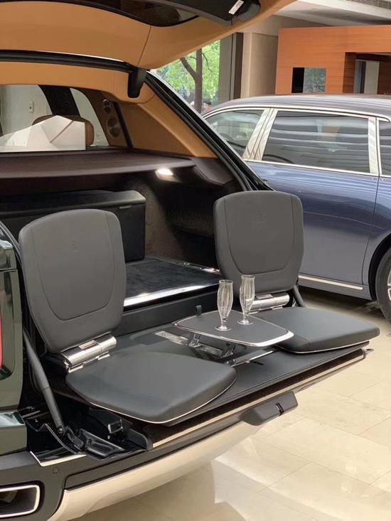 库里南的尾门采用双段式开启,消费者可选装劳斯莱斯首创的揽景坐席,在点击一键开启后两张皮质座椅与鸡尾酒桌便会从行李厢暗格中升起。两张座椅均采用真皮包裹,触感细腻。同时,座椅和鸡尾酒桌都支持折叠,这样的设计使得行李厢内部空间不会被过度侵占。矩形尾灯组颇具新意,内部还加入了直立的细灯条,点亮后视觉效果极佳。