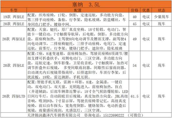 天津港直营丰田塞纳,现车国五排放为3.5自然吸气,国六也可以行预定,后期塞纳要进行改款。2020款丰田塞纳商务车在天津港口销量一直很不错,口碑也是越来越好,编辑从天津锦润鑫泽汽车销售有限公司了解到,现在天津港直营店为增加销量,特举行促销不断送礼不停等活动,具体优惠可关注文章最下方联系方式。电话或者加微信到店都可享受贵宾待遇。国六现已现车,接受预定,欢迎来电。