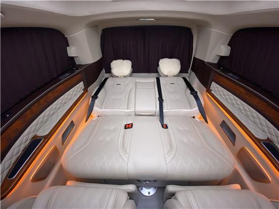 第三排是可以放倒的航空座椅,但是因为它是”连体“的,业内人士也称之为沙发床,同样它也带有加热、按摩、电动脚拖还有真皮座椅;后排沙发按摩座椅电动调节,根据身体的需求调节出最舒适的乘车角度,一键成床效果让躺卧成为现实,疏散一身的疲惫与烦忧。