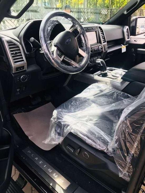 新款F150它的表面颇具动感,内饰奢华,配置富厚,同时兼具跑车的动力机能、越野车的全地形制霸本领和豪华轿车的乘坐恬静性,并且它的改装空间也很大。车内配备标准独特的皮革和布艺装饰的座椅,驾驶员侧的电动十向调节。这些座椅同时具备记忆功能。中央控制区搭配了触控式显示屏,其下方则是多媒体控制区及空调面板,采用旋钮 物理按键的组合。中控功能区域可分为三个小控制区,最上端为音响控制及导航控制,中间为收音机调节控制,最低端为空调及座椅加热控制。在内部空间的庞大基础上,福特也提供了非常具有舒适性与服务性的内饰配置。另外,新车还配备了一块大尺寸的全景天窗。