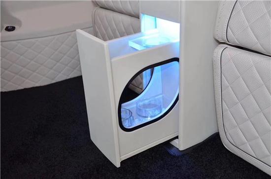 这台车为什么叫奔驰迈巴赫版VS680呢,主要是后舱的内饰和迈巴赫的原厂座椅。车身全部皮革包覆,檀木面板奢华点缀,牛皮地毯,迈巴赫宫格顶灯,以及绒质窗帘一应俱全,还有两张定制的迈巴赫总裁座椅,十分舒适豪华,通风加热,气压按摩,三段调节等功能加持。后排的沙发座椅可以放平成为双人床,尾车上出行人员提供舒适的休息。