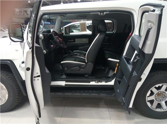 丰田FJ酷路泽内饰实用而简洁。门把手、门内把手,以及空调和音响的按钮,均使用了加大设计,即使戴着手套也能很方便地使用;而采用橡胶类的地板垫材料、防水且透气性良好的座椅设计等,易于清洁,让驾乘者保持心情愉悦。