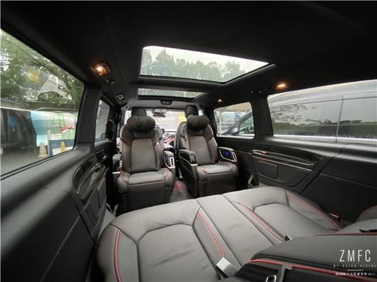 奔驰v260商务车报价进入后舱,前后排空间非常大,顶部氛围灯照明非常丰富,当然在阳光明媚的日子,你仍可以打开天窗。
