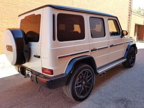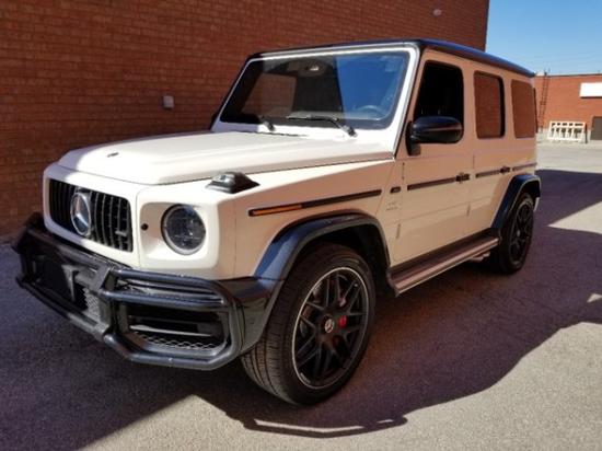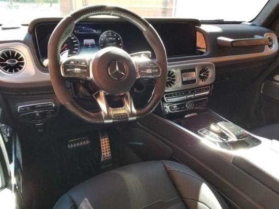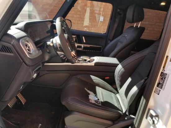 此车配置; 20款加版奔驰G63 钻石白/黑 钻石白金属漆、暗夜运动包、座椅舒适包、黑色外观套件、钢琴漆木饰、碳纤维方向盘、黑色防撞杠、22寸黑色轮毂、AMG方向盘组件 国六