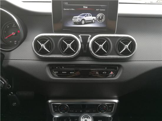 全新奔驰X级皮卡车采用全黑色设计装饰,四个并排的银色镀铬装饰出风口设计,悬浮式液晶屏设计比较抢眼,仪表盘采用双圆形设计,配备自动换挡器和环绕立体声。内饰设计和材质看上去比轿车差一个档次。