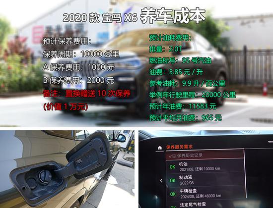 俗话说买车容易养车难,尤其像宝马X6这样的豪华SUV,养车成本到底高不高呢?2020款宝马X6保养周期为10000公里,其中A保预计为1000元左右,主要是更换机油机滤,B保大概为2000元,如果您是置换的话店内将赠送您10次A保,相当于1万元保养费用。油耗方面,新车燃油标号为95号汽油,目前北京地区油价为5.85元/升,2.0T官方油耗为7.9L,为了更接近真实,郝哥以再增加2个油计算,也就是百公里9.9升,假如每年行驶20000公里,那么预计年油费为11583元,平均月油费为965元。