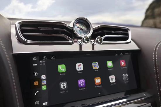 21款宾利添越中控屏幕上方的空调出风口变成了飞翼式造型,再与中间的百年灵钟表相融合,宛如意化后的宾利车标,设计十分巧妙,多功能方向盘进行提升,并升级了12.3英寸全液晶仪表和10.9英寸中控屏幕。这块屏幕拥有防反射和防眩光图层,支持CarPlay和Android Auto互联,科技感紧随当下。