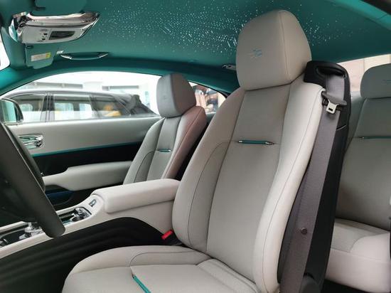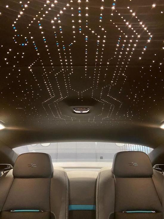 进入车内,劳斯莱斯也为魅影Kryptos Collection版增添了更多“密码”元素来与外观做呼应,其中最为特别的当属与外观相同的青绿色星空车顶,同时光源的布局也采用类似电路的排布,视觉效果不俗。