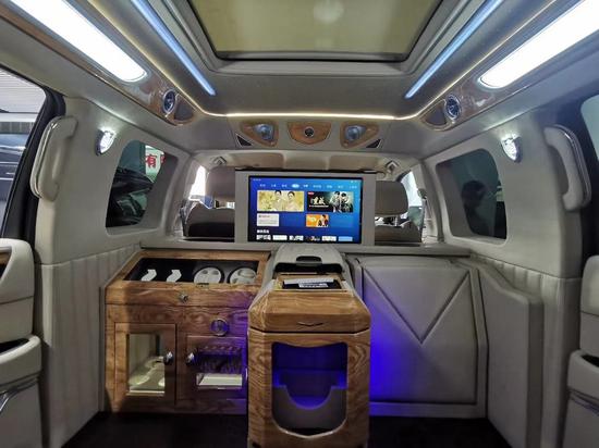 四座凯雷德总统一号升降一体化的40寸液晶电视,还可以联接网络,车内配备有4G无线WIFI路由器,购车后你可以处理一张流量卡,你的车子就会有WIFI网络,就像家里相同,手机也可以用,非常便当,有的老板喜欢看新闻,这样便于老板出差也能随时收看到新闻频道。