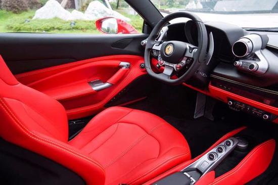 法拉利F8的内饰除了皮革材质也可以选择碳纤维+Alcantara,看起来则更加战斗。两块小的液晶屏加上中间一个炮筒式的转速表沿用了法拉利最新款的设计,除了多功能方向盘外,在副驾驶前还增加了一块7英寸的液晶显示屏,显得科技感十足。
