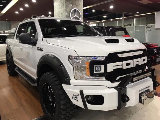 新福特F150方方正正的前大灯与前保险杠造就了完美的车头造型与比例,进气格栅采用蜂窝状网格设计,并配以雕刻式的福特品牌标识。其前保险杠相当硬朗,且保险杠下方配备金属护板,以应对极端路况环境。整体的车架由高强度钢冲压而成,这样不但提高了车身的耐用性,更对乘客在安全方面有了进一步的保证。