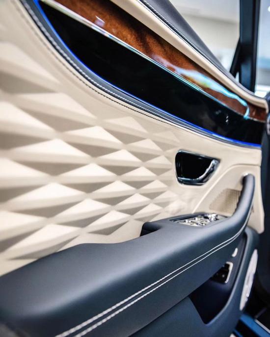 车门板可选配触感极佳的立体菱形真皮内饰,这个设计灵感源自于 Speed 6 概念车。Mulliner 驾驶套件还包括 22 寸方向型轮辐轮毂,并有 2 种轮毂颜色可选。